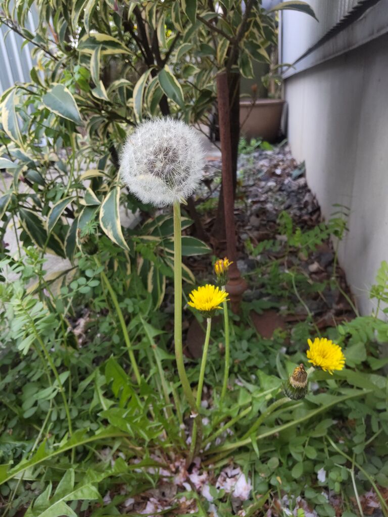 隣との境になっている低いコンクリート塀に添って、ヨモギが大繁殖しているのですが、そこからは少し離れた場所に何株かタンポポが生えてきていました。そのひとつにきれいな綿帽子ができていたので、まずはスマホで撮りました。